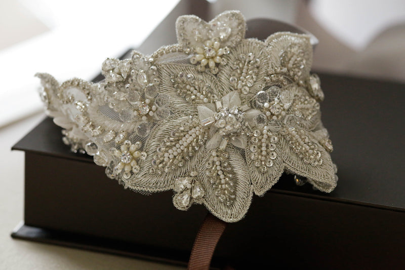 This floral bridal sash is mainly silver color and embellished with swarovski elements and beads. The beaded section measures 11.5 inches in length and the max width at the widest point is approximately 3.2 inches. Can be directly sewn on to the dress or attached to a ribbon.